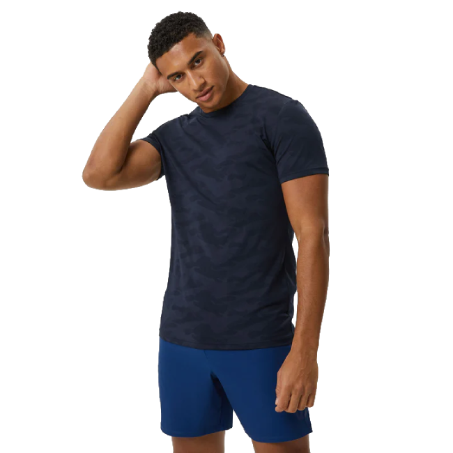 Vyriški „Björn Borg Borg Performance“ marškinėliai, pagaminti iš minkšto perdirbto poliesterio, tampraus žakardo megzto maskuojančio rašto.