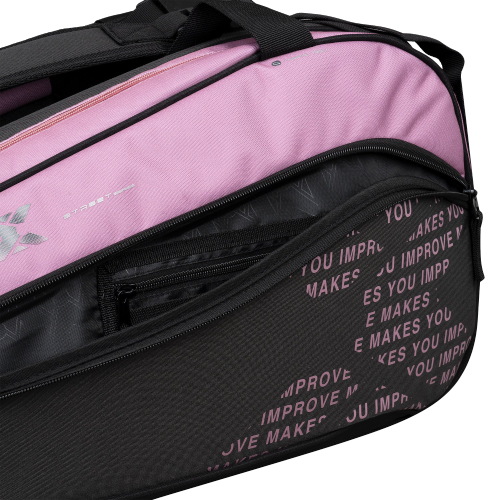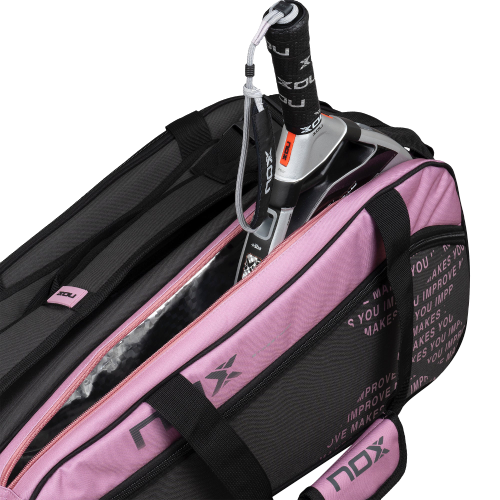 Erdvus pagrindinis skyrius: šoninė anga, talpinanti 3 padelio raketes, drabužius ir kitus būtiniausius daiktus. Pagrindinis skyrius su šonine anga, kuriame telpa 3 padelio raketės, drabužiai ir kt.
