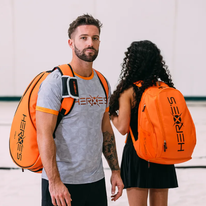 Sportinė padelio kuprinė Heroes, pagaminta iš sintetinės odos, pasižyminti moderniu ir funkcionaliu dizainu.